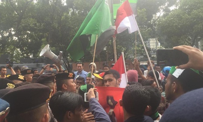 Tetapi kemudian aksi massa ini dihalau oleh aparat kepolisian. Massa dan polisi pun sempat saling dorong. Suasana pun semakin memanas. Sejumlah massa aksi pun ada yang diamankan oleh polisi.